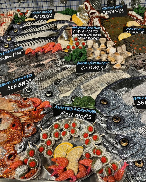 We are delighted to be bringing Kate's fantastic work to the gallery for what will be a truly special exhibition. Select items (such as sequinned anchovies, knitted prawns, embroidered oysters and mussels and more) from the counter to create your very own framed bespoke seafood platter. As well as beautifully crafted readymade framed pieces of varying fishy subjects and sizes.